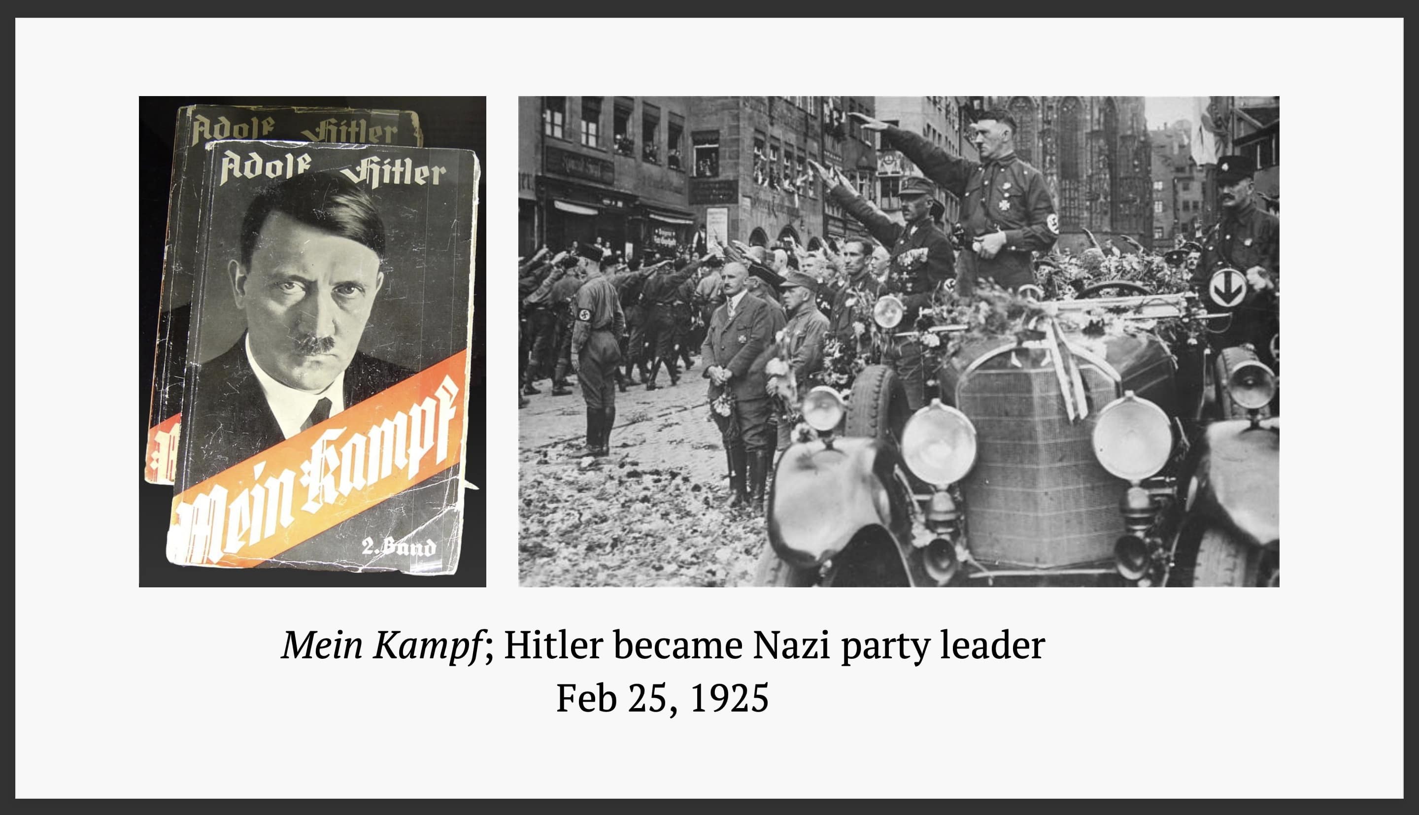 But let’s just go back by 100 years. In 1925, Hitler came out of prison. He went to prison because he attempted a coup against the Weimar government and failed. He was sentenced to 5 years in prison but was very quickly bailed out. In 1925 he came the Nazi party leader. Mein Kempf is the book he wrote in the prison, where he talked about his struggle and his political ideology, which is a widely read book and banned because it obviously contributed to the massacre of Jews.
