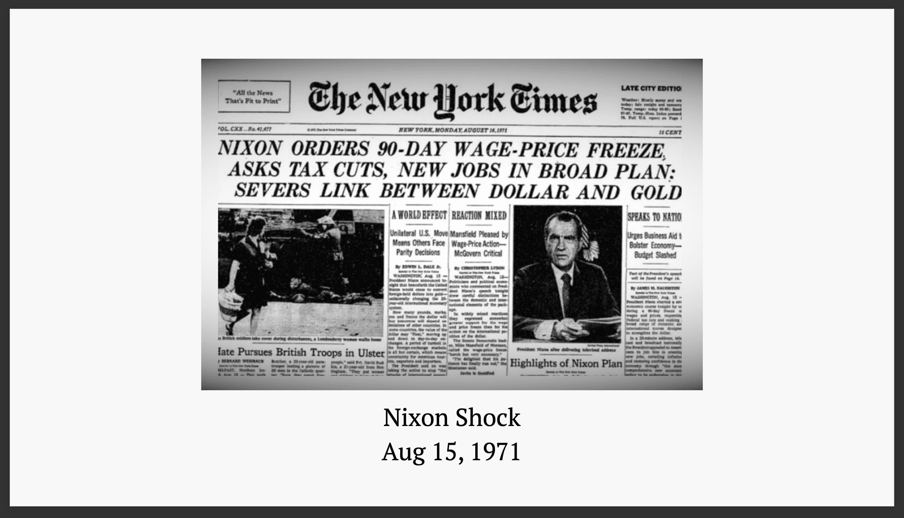 So with redemptions, and rampant speculative trading activities, what happened in 1971 was the Nixon Shock. Ok, everybody cools down, and from today no one can redeem the US dollars for gold. This severed the connection between the US dollars and the gold. Widespread controversy and panic ensued. What’s the worth of the US dollar now if you can’t redeem it for its underlying asset? As if it has become a game coin.