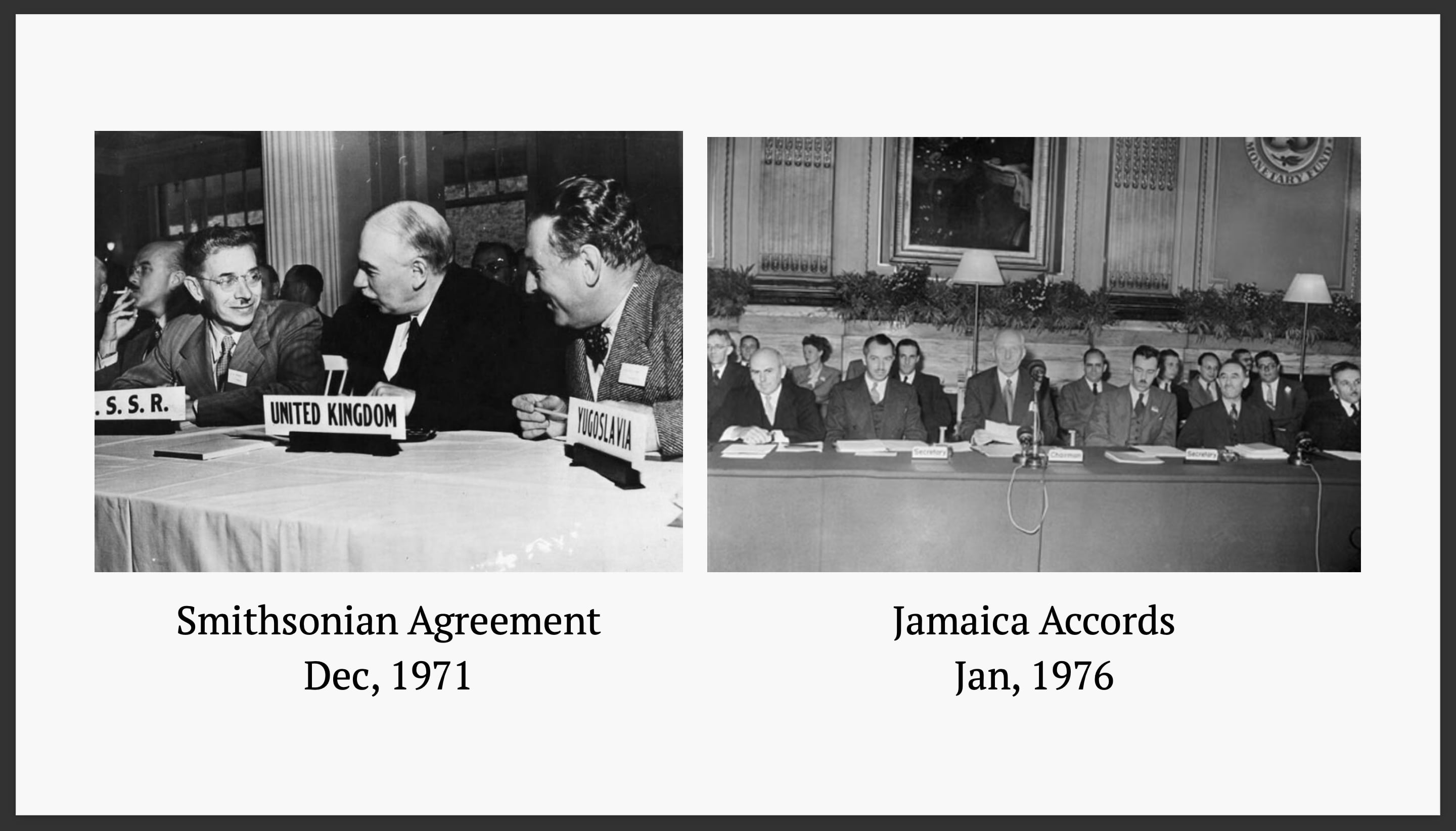 Immediately at the end of the same year was the Smithsonian Agreement. If everyone questions the worth of the US dollar, let’s devalue it. It was devalued by 8.25% at the end of 1971. And other currency were renegotiated. For reasons such as the oil prices and other things, which we will cover later, in 1976 basically everyone gave up and said ok from now on, the currency rates are floating.