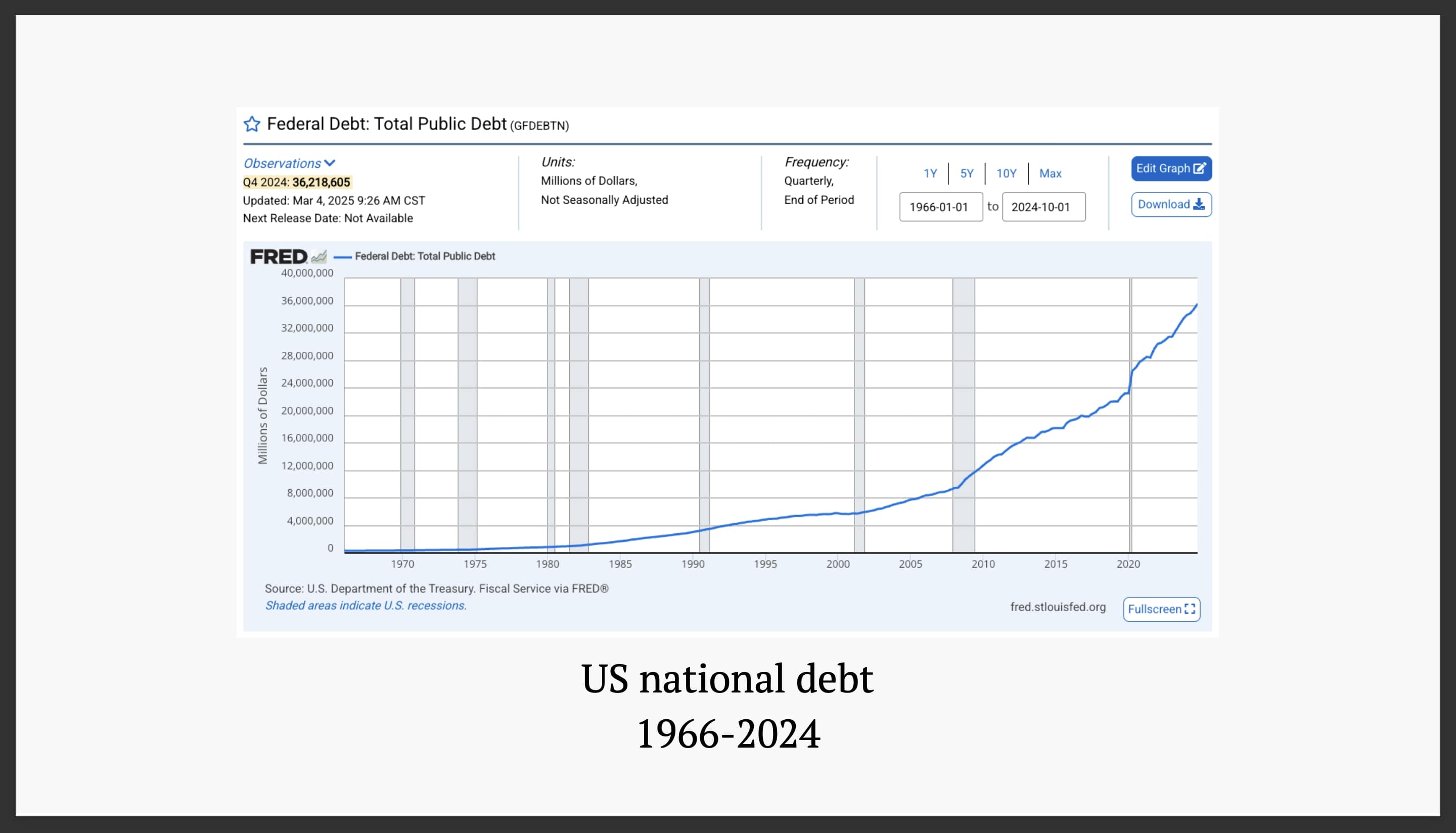 This is a screenshot of the federal debt chart. Right now US debt stands at $36 trillion. There was an act in 2023 that froze the debt ceiling two years ago until January 2025, around the time when Trump came to office the second time. The ceiling came back. Now the ceiling has been breached already, meaning the US government is in the regime of exercising extraordinary measures - cutting down aids for poor people, cutting down social programs, including aids that go to Vietnamese families who suffered from the Vietnam war.