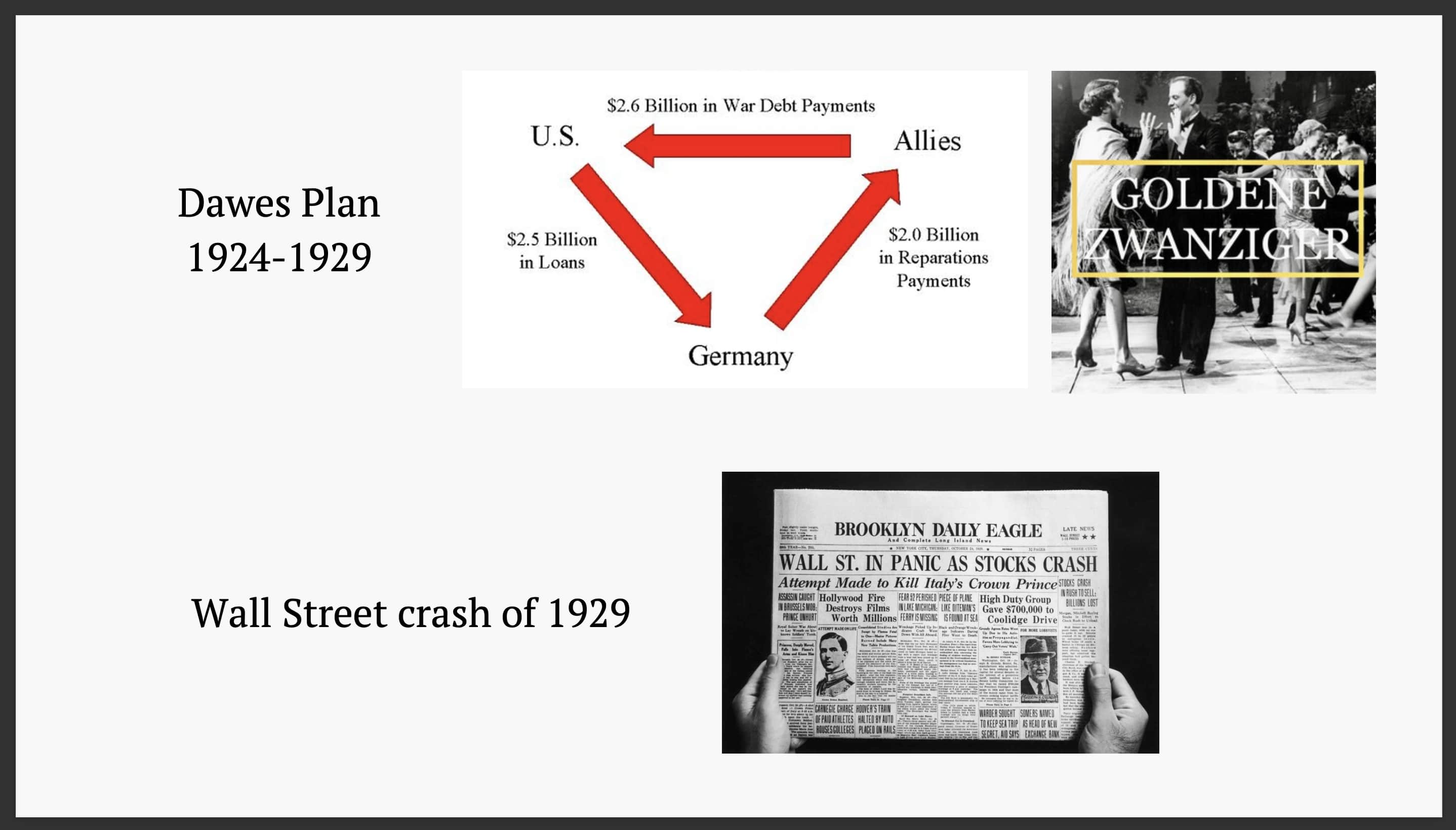 Going to 1929. What happened in 1929 was a bunch of things. But we have to cover the Dawes Plan. Basically Germany came out of the WWI, losing the war, owing a lot of money to the Allies countries. So Germany had to pay for the reparations for other European countries. That put a lot of pressure on the German economy. Therefore a plan was in place for the US to loan money to Germany to pay for the reparations. Because of this loan, the economic pressure was relieved and that actually caused a golden period, the Goldene Zwanziger, where the economy was booming. That was when the hyperinflation just receded around 1923. But what happened in 1929 was that the Wall Street crashed. If you’re American and your economy is not doing so well, the first thing you would cut is paying the country that just lost the war. So the US cut down their loans to Germany and asked for repayments sooner, causing the German economy to deteriorate very quickly. So that was the historical context where the Nazi rose.