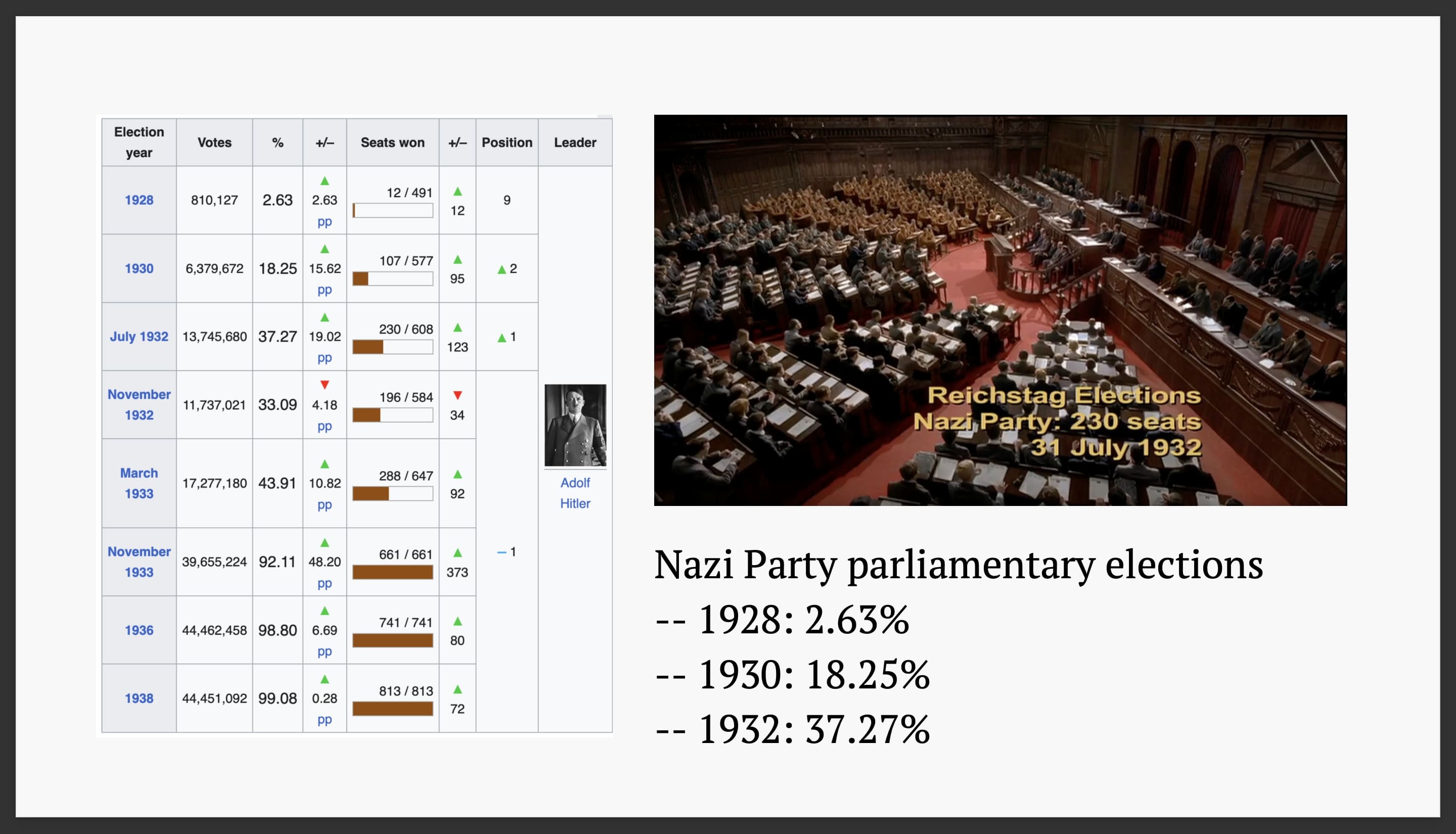 If you look at these election results of the Nazy party at the German parliamentary. In 1928, the Nazi party got 2.6% of the parliament. Already in 1932, just four years later, it’s got 37% of the parliamentary. It was a very fast rise.