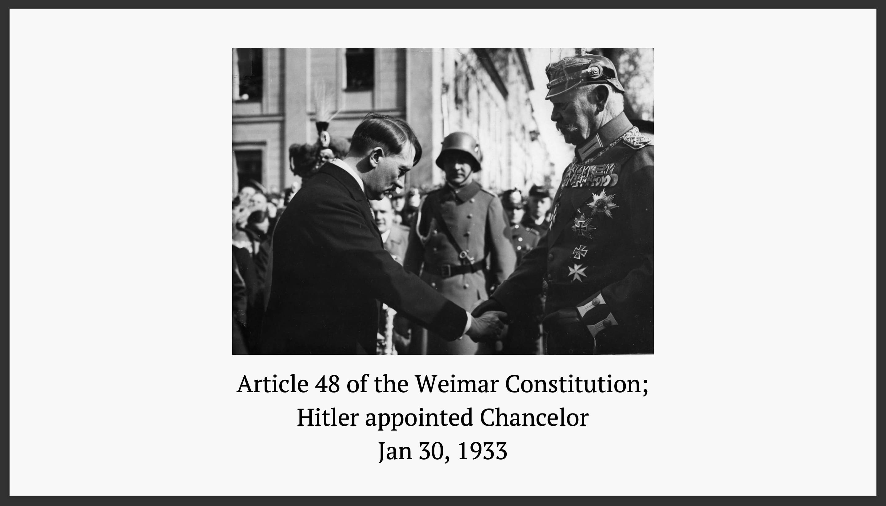 Article 48 of the Weimar Constitution basically meant that before Hitler became the Chancelor, the parliamentary was blocking so many laws from passing, obviously Nazi being very much at odds with other parties. They couldn’t reach consensus and the parliamentary broke down all the time. If you have a parliamentary breakdown, no laws can be passed, the government basically stops operating. So Article 48 was the idea that in extraordinary time, the president can sign special laws that go into effect immediately, bypassing the congress. But that means the democracy was failing, which further incited people’s anger, espeically the people that were under Hitler’s influence.