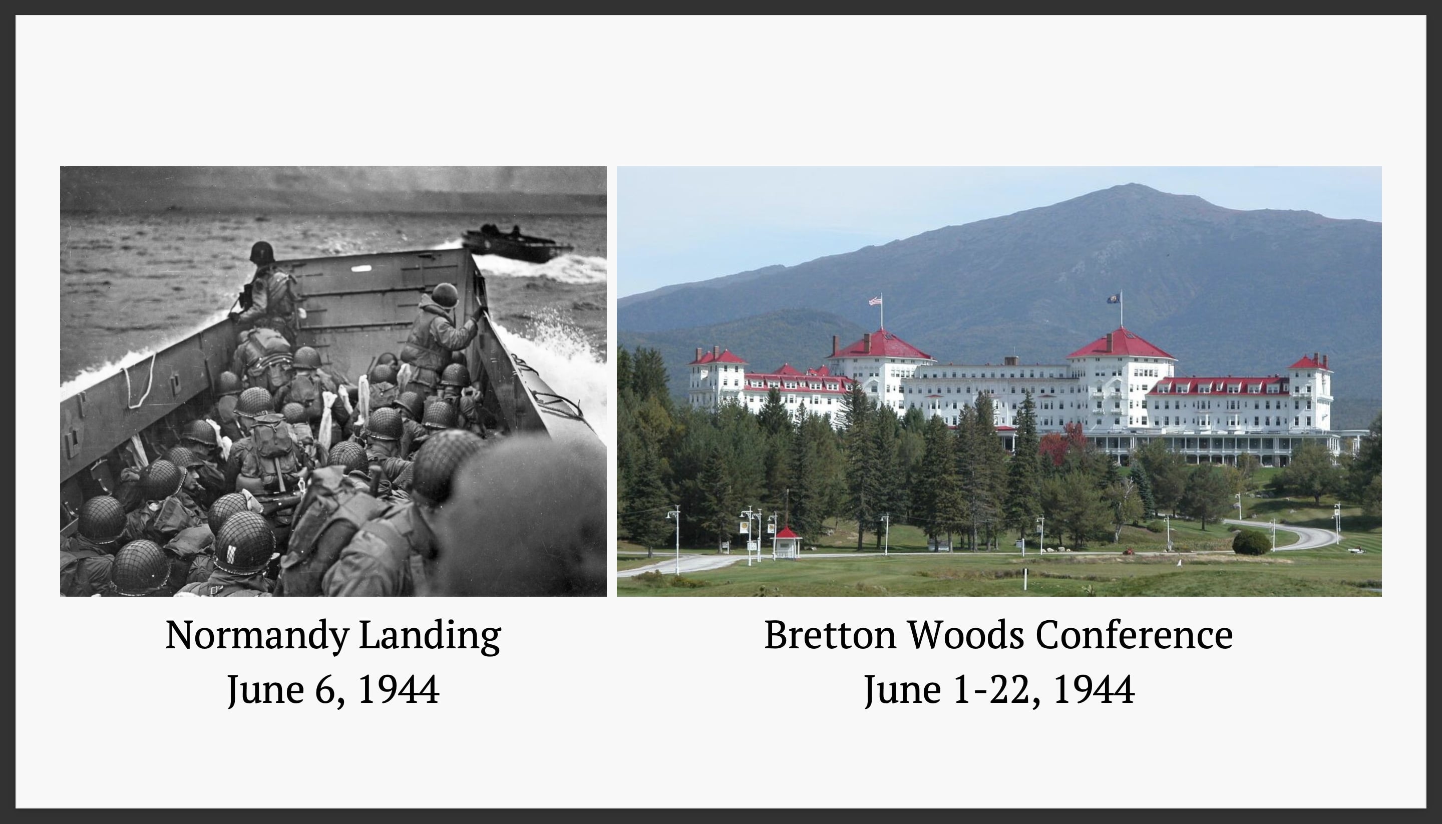 WWII happened. Fast forward to 1944. Germany was losing. At the time of the Normandy Landing, on June 6, 1944, another very famous conference that was quietly happening but determining the world order after the war was the Bretton Woods Conference, between June 1st and 22nd, 1944. It happened in this very old and shabby hotel where the leaders of many countries came to talk about “so what are we going to do with our money after the war?” Because, in a sense, Germans started the war because there was tremendous monetary problems and the order of money. In order to prevent another war from happening - 50 million people died from WWII - let’s find a much better world order for international monetary system.