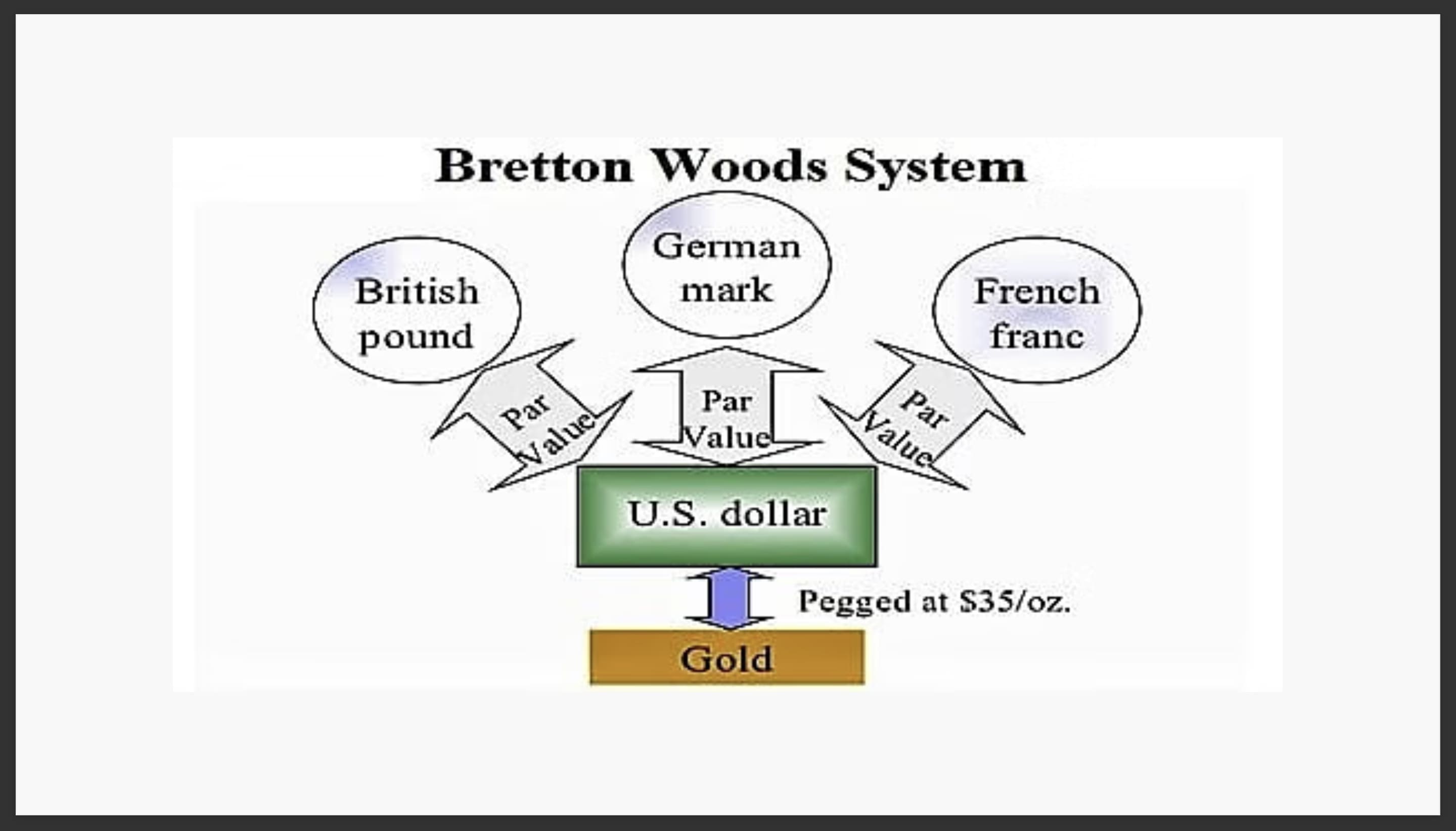 So eventually we came to this Bretton Woods system. The idea is that gold is rare and everyone wants gold. Gold is cleraly the desire of all human beings. Let’s use gold as the ultimate value denominator. Let’s fixed the US dollars to one ounce of gold exchanged for 35 US dollars as a constant. And let’s negotiate fixed exchange rates between the US dollar and each of the currencies of other nations. So all the rates were determined at the conference, obviously a lot of politics were involved, based on who contributed and who had stronger voices. But this was the order coming out of WWII.
