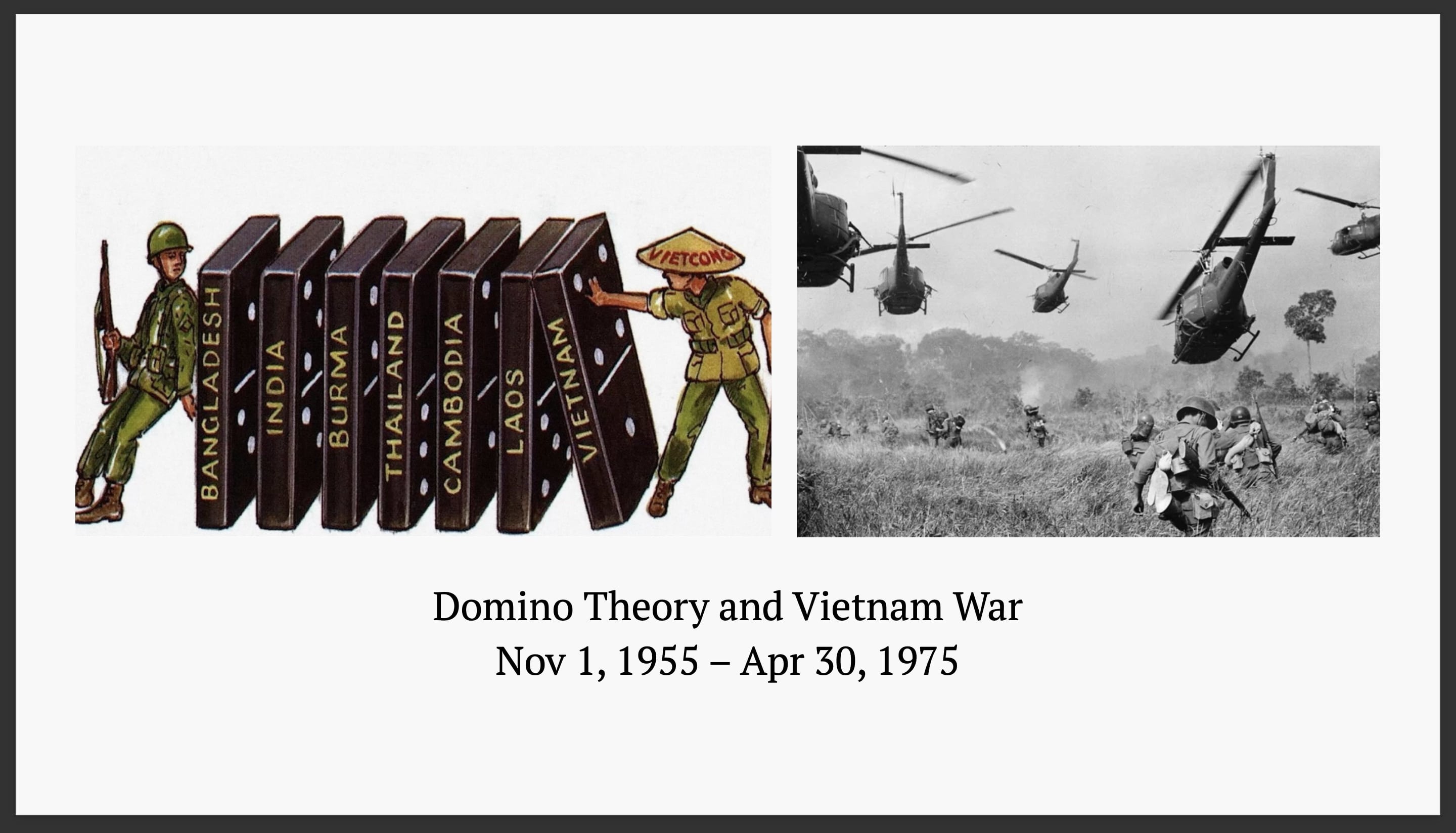 But what happened after WWII in ten years time was the Vietnam war. There was a dominant theory called the Domino Theory. The idea is that the US feared communism and they wanted to contain communism from spreading from the Soviet Union and China. They had to stop it from spreading across Vietnam because the Domino Theory stated that if Vietnam were to be lost to communism, it would spread through other countries eventually reaching all the other South Asian countries. So Vietnam was where the fight had to happen. But there were agreements in place that forbid Western countries from putting armies in Vietnam. So the US deployed military advisors, who didn’t carry guns and were supposed to teach people how to fight their own war, sort of technically bypassing the agreement. That was in 1955.
