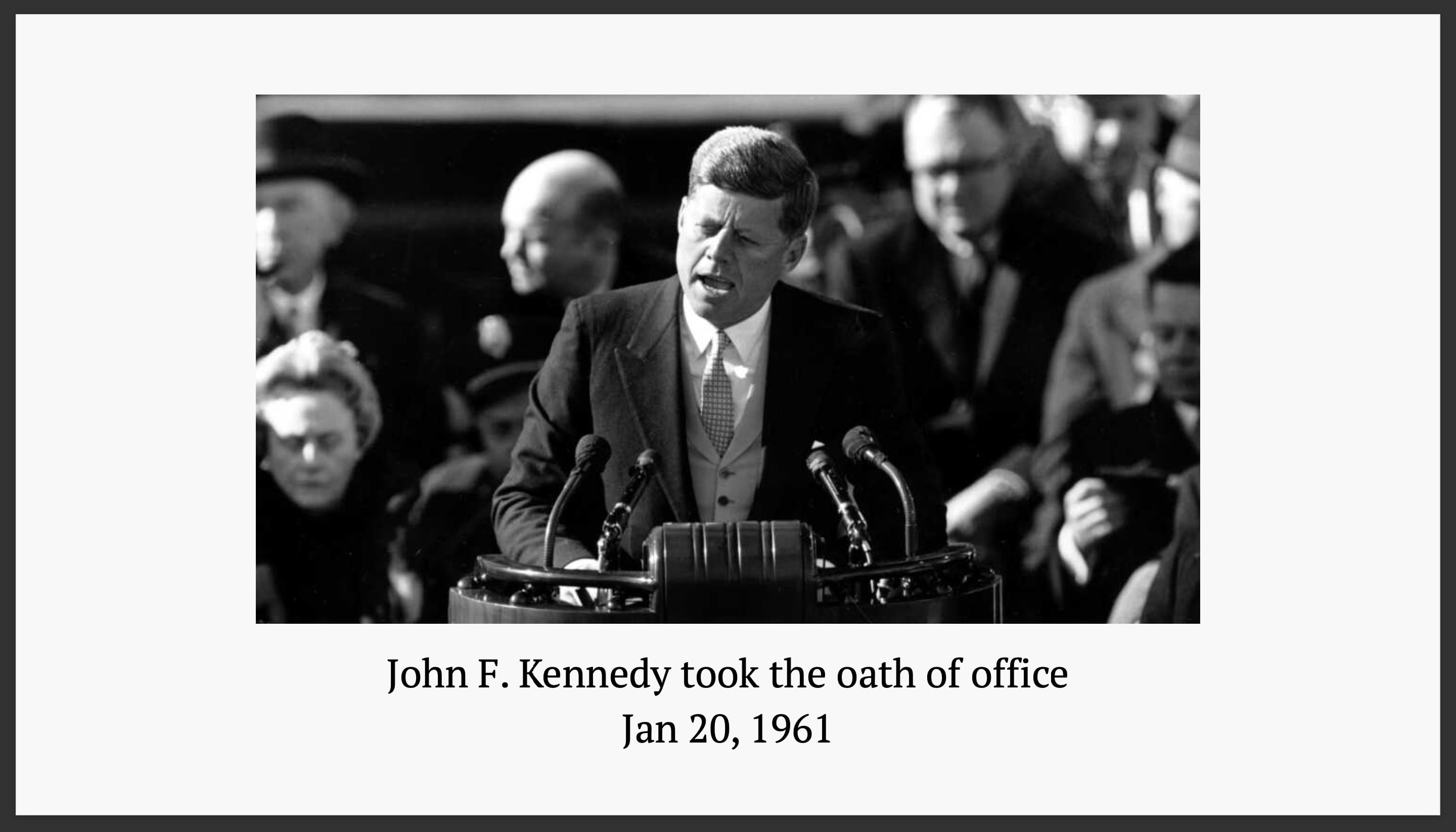 John F. Kennedy became the US president in 1961. The idea was that he was going to protect the liberal world order. I’m going to read a little bit from his inauguration speech when he took the office. “Let every nation know, whether it wishes us well or ill, that we shall pay any price, bear any burden, meet any hardship, support any friend, oppose any foe, in order to assure the survival and the success of liberty.” Which meant that the US increased spending and its involvement in Vietnam.