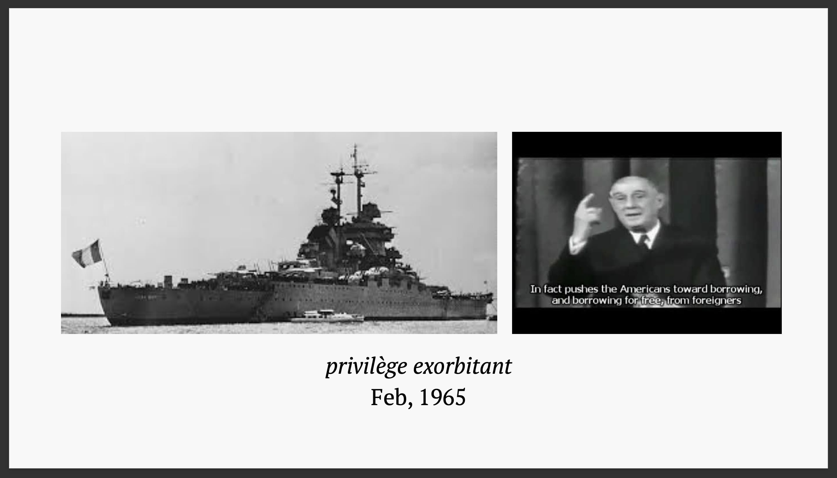 In 1965, there was this idea of privilège exorbitant. Enormous privilege was conferred to the country whose money was the international settlement dollar, allowing them to not care about trade imbalances while all other countries had to. What happened was that French warships carrying US dollars from the French treasury were sent to New York to redeem said dollars for gold from the US government. Many countries followed suit. This caused gold to exit the US. After the WWII, the US had 70% of circulating gold worldwide. With these redemptions, the US had gone down to 40% of the global gold. And you can’t have only 40% of the gold worldwide for backing the international dollar. It stopped making sense.