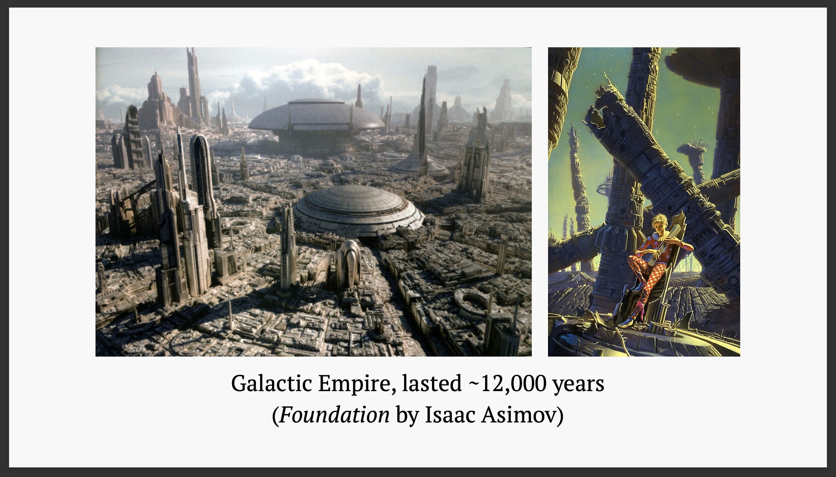 This comes from the Foundation series by Isaac Asimov. There’s a galactic empire that governs the entire galaxy. I thought it might be interesting to read a little bit from the book itself, what happened to this great empire, specifically to Trantor, the central governing planet: