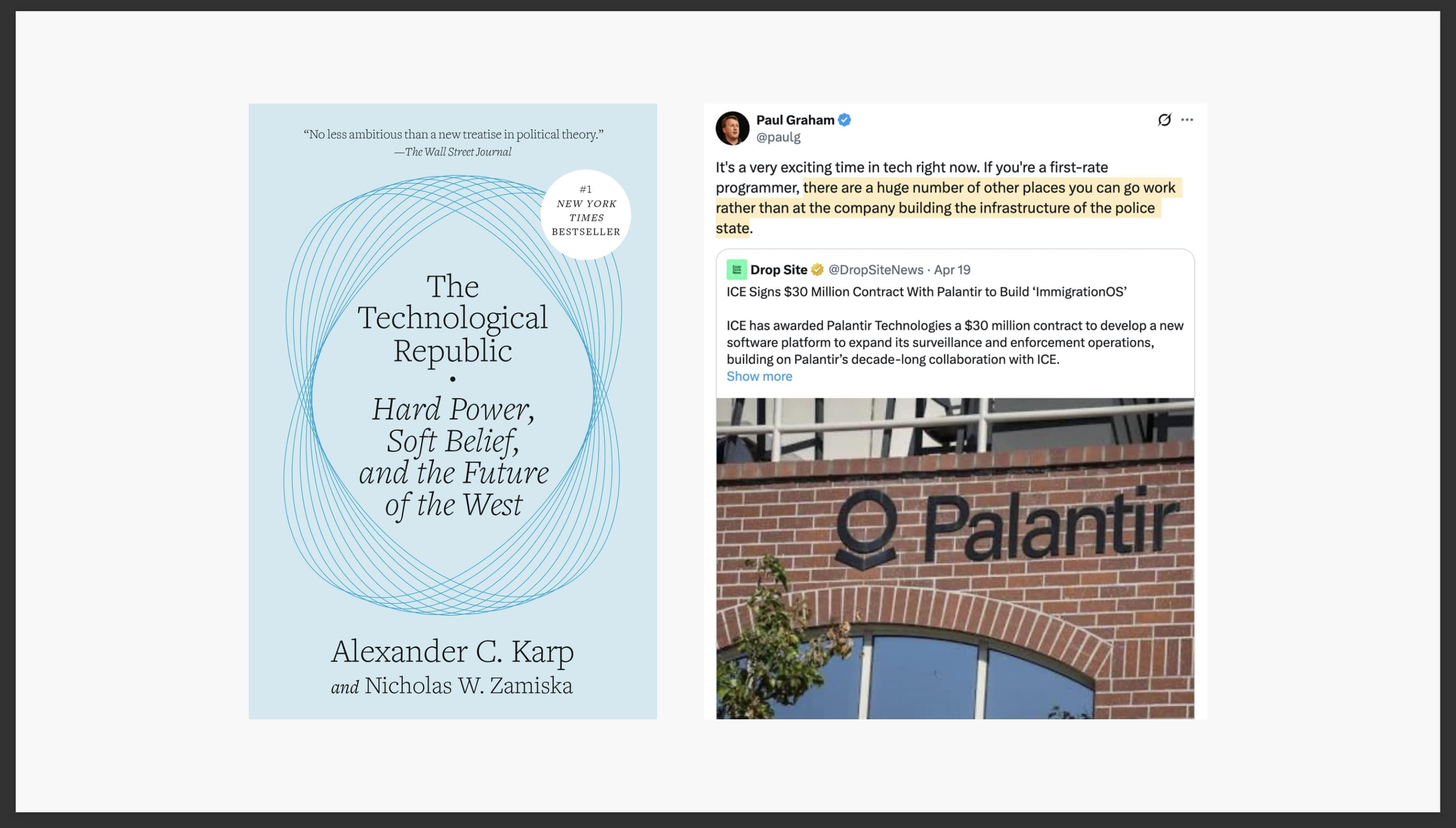 On the right, this is a heated discussion that happened on Twitter less than a month ago. Palantir started working with the US immigration office to apply their technology to real-time identification of those who overstay their Visas so they can be deported as soon as possible. Paul Graham of Y Combinator said that talented programmers have many avenues to invest their talents rather than working for the police state.