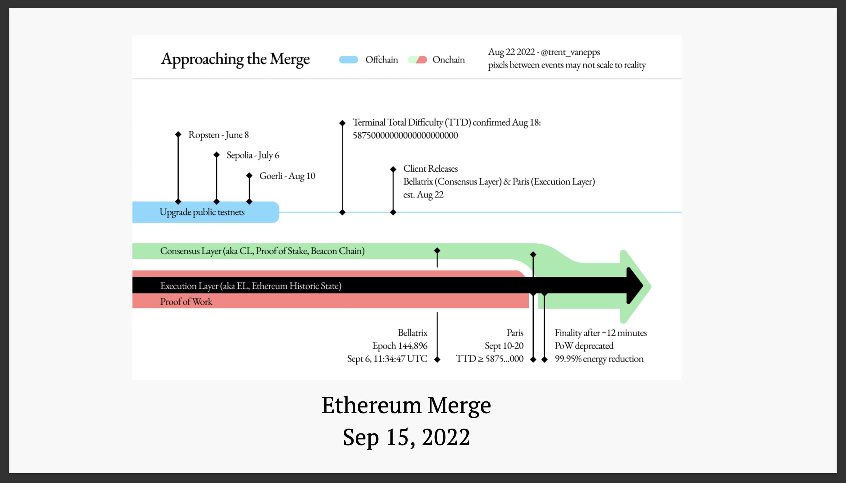 In 2022, the merge happened. The Ethereum codebase was modularized into consensus and execution client. At the merge proof-of-stake consensus clients replaced their proof-of-work predecessors.