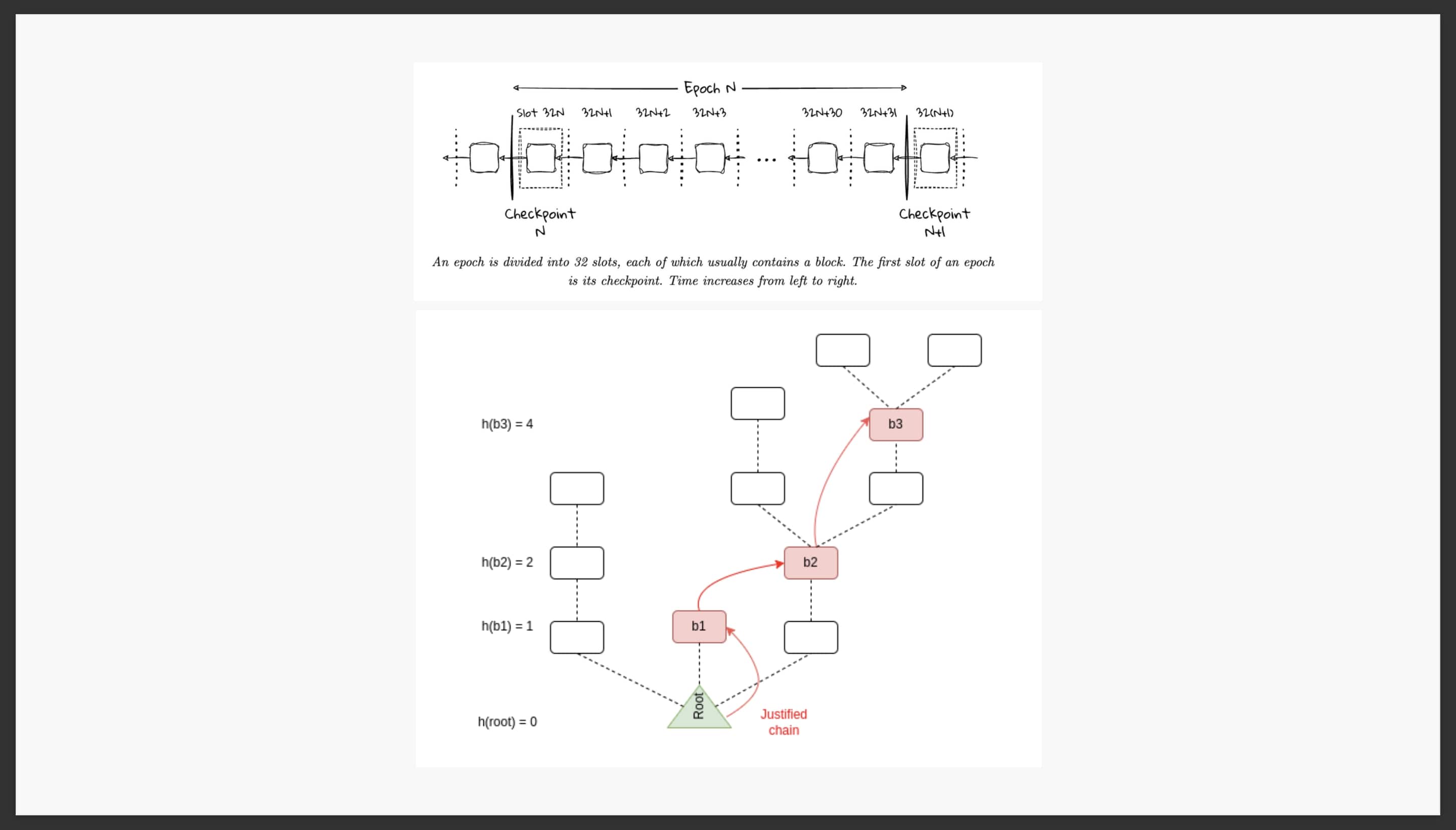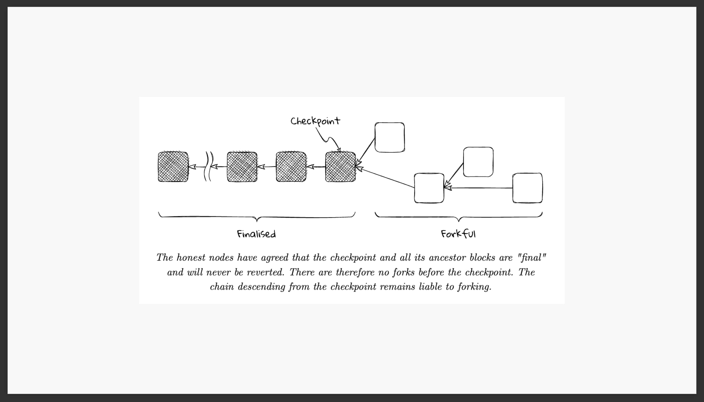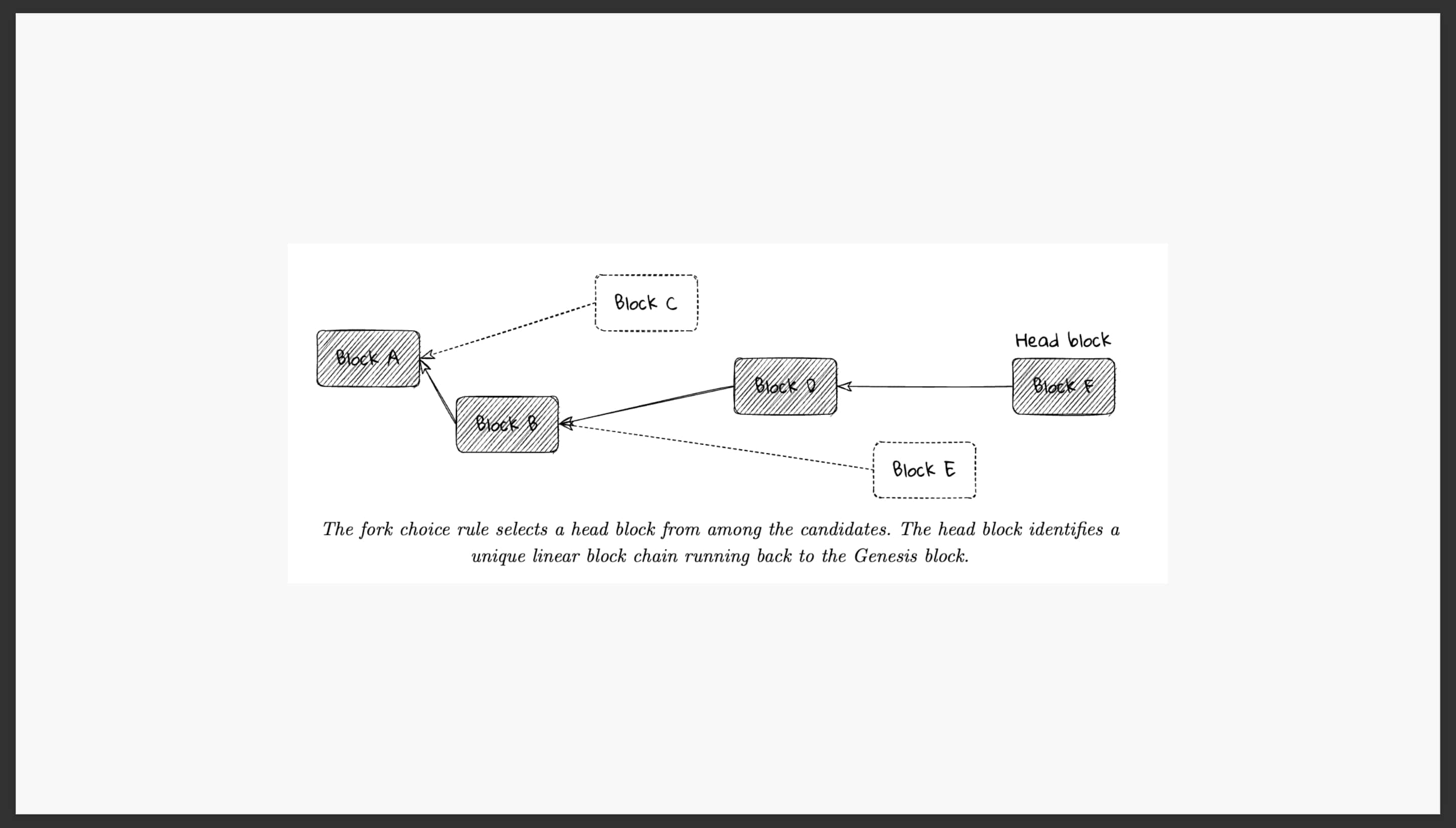 We have covered how the fork choice rule works to find a linear sequence of blocks. What Ethereum also does is it can finalize this path. Unlike Bitcoin, which strictly speaking does not really finalize things. So in Bitcoin or Bitcoin-like systems, you can have drastic shift from a linear path to another linear path because some minders were mining many blocks in secret with superior hash power. This is undesirable, because the users don’t have the strict guarantee that what’s onchain will stay there forever. It’s a problem of probability. That’s why Bitcoin recommends a 12-block waiting time.