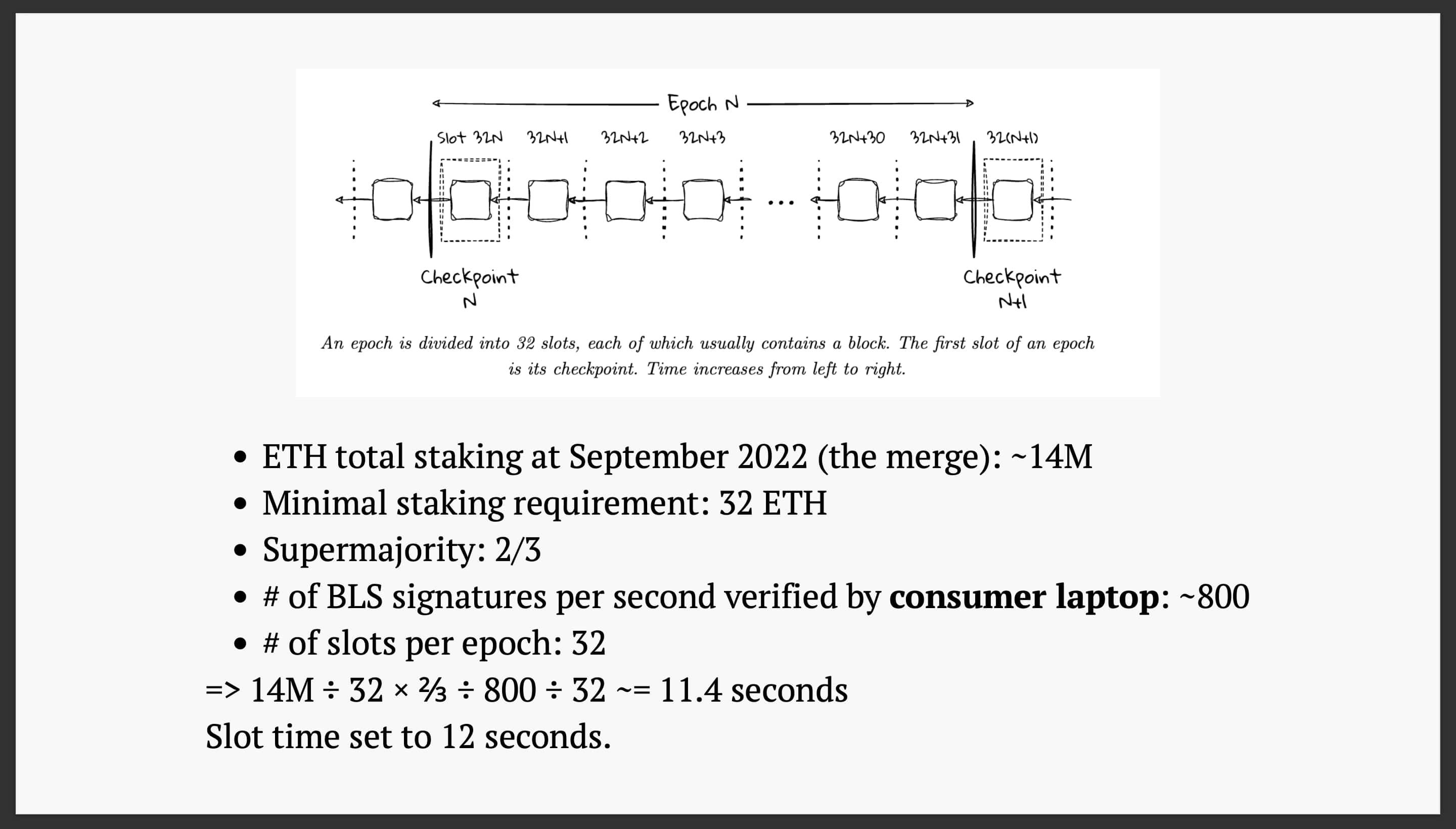 - However, a 365-second slot time is not very useable. One must wait about 6 minutes of a spinning circle for just the earliest sign of transaction confirmation. So Ethereum divides up the validators into 32 groups, and distributes the attestation job across 32 slots, one group per slot. The amount of signatures to be verified per slot becomes 14M/32*2/3/32 ~ 9110. The slot time acceptable by home stakers become 9110/800 ~ 11.4 seconds, which gets us very close to 12.