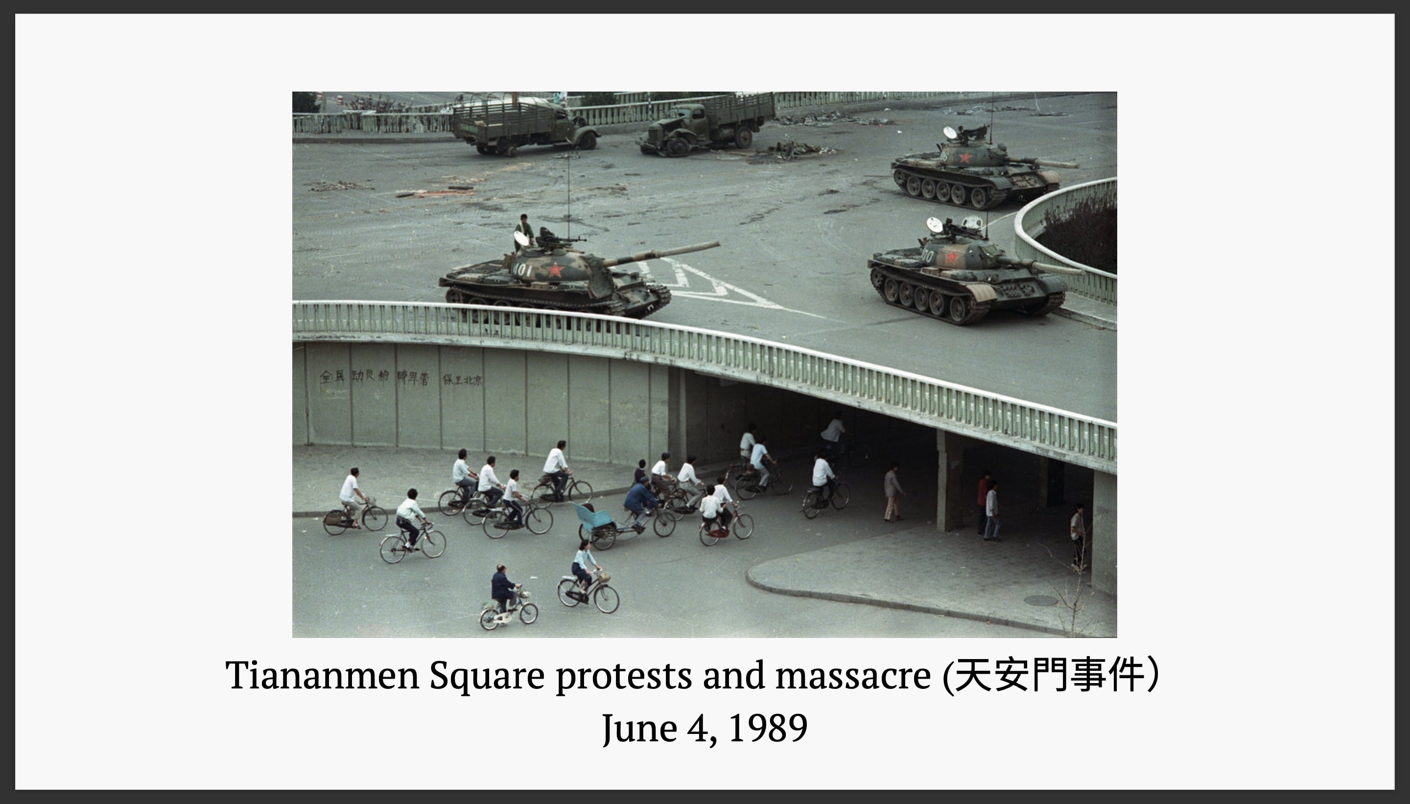 The Tiananmen Square protests and massacre transpired on June 4, 1989. Around 100,000 soldiers and 200 tanks rolled into Beijing. Estimated 3000 civilians dead.