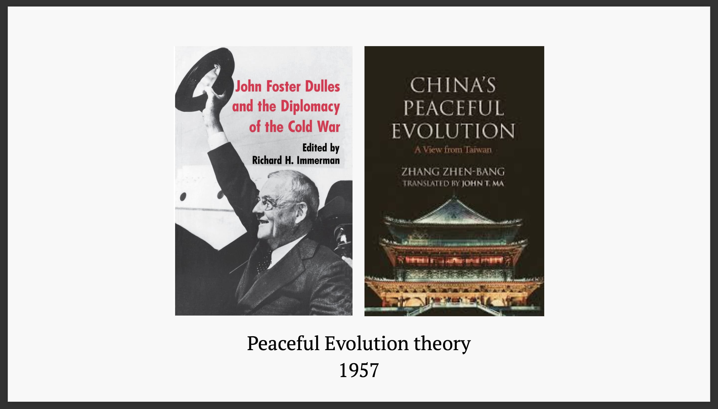 There is a long-standing ideology that all human beings ultimately desire and pursue the “Western” values: liberty, democracy, enlightenment and so on. All human beings eventually trend towards those values. After WWII, the US practiced the policy of containing China just like how the Soviet Union was contained. The strategy was based on the idea of peaceful evolution: due to the universal desirability of the Western values, eventually, the Chinese people would peacecfully demand democracy for China.