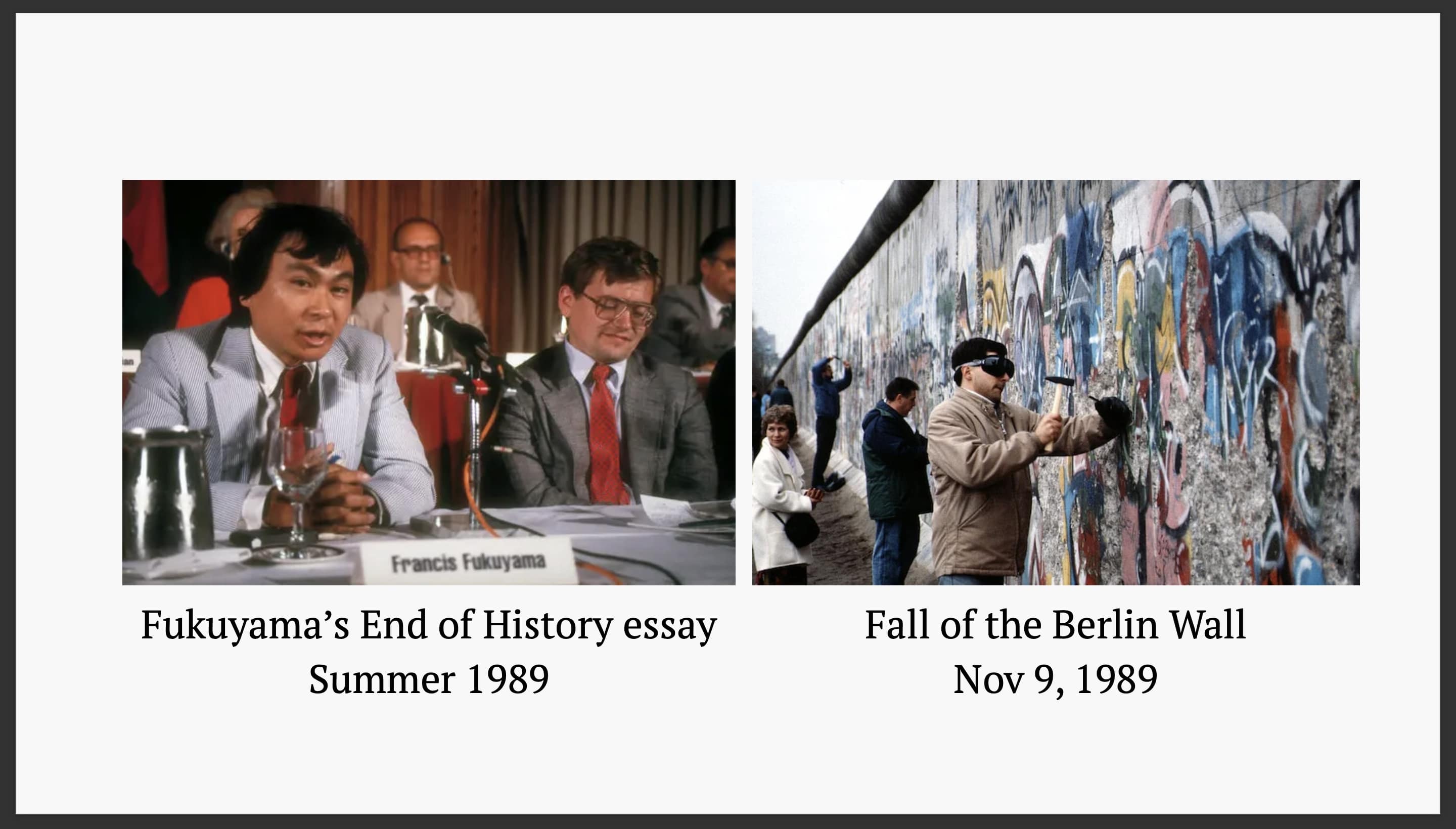 The essay came out and was not well received, but at the end of the same year the Berlin Wall fell. The essay was propelled to stratosphere.