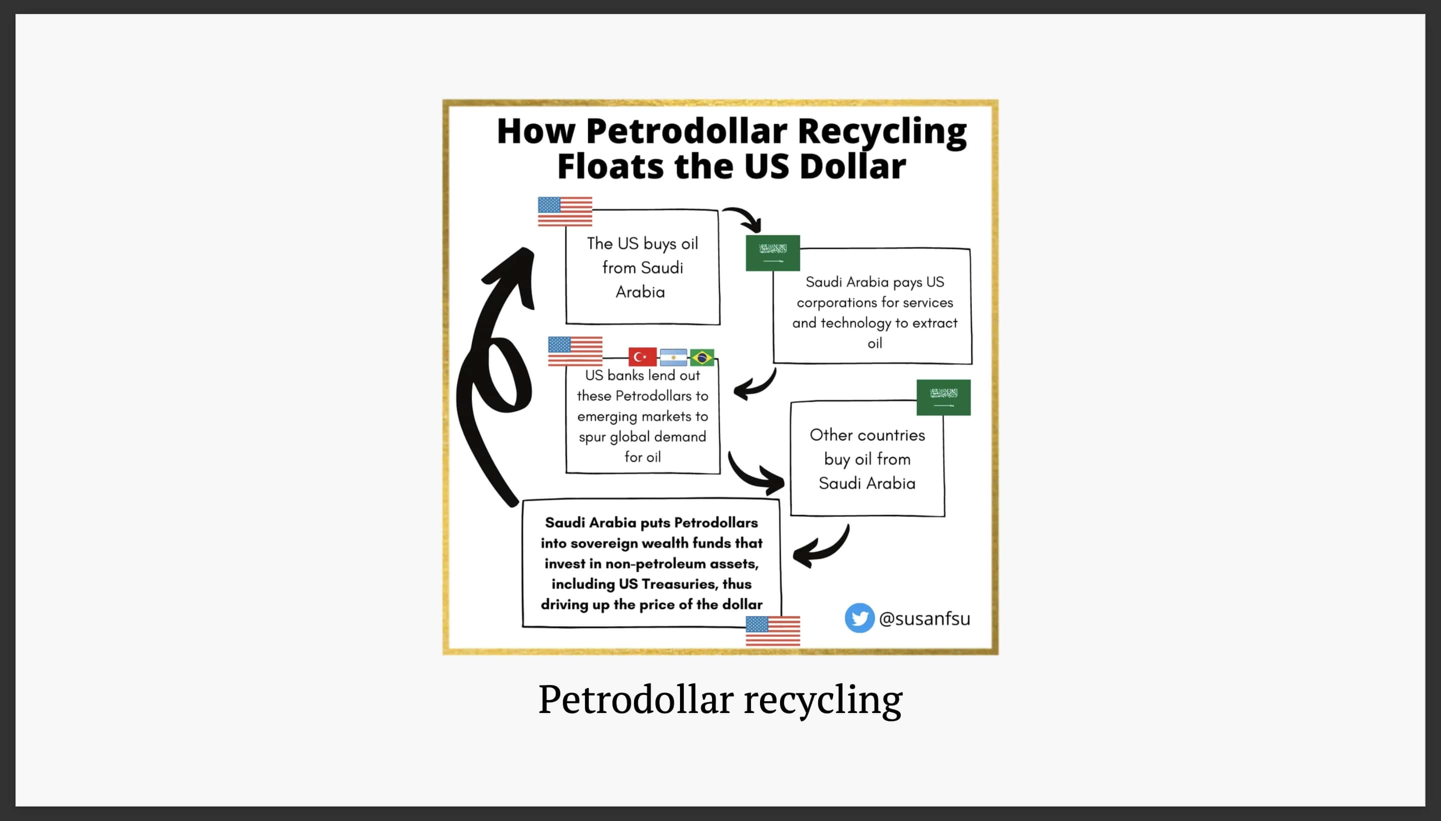 The idea of petrodollar recycling is that Saudi Arabia would price their oil in US dollars, take the US dollars it earns through oil export and reinvest them US financial assets, primarily by buying US bonds and equipments for oil excavation. In return, the US offers military support. This created a sustained global demand for the US dollars and reinforced its status as the world’s reserve currency.